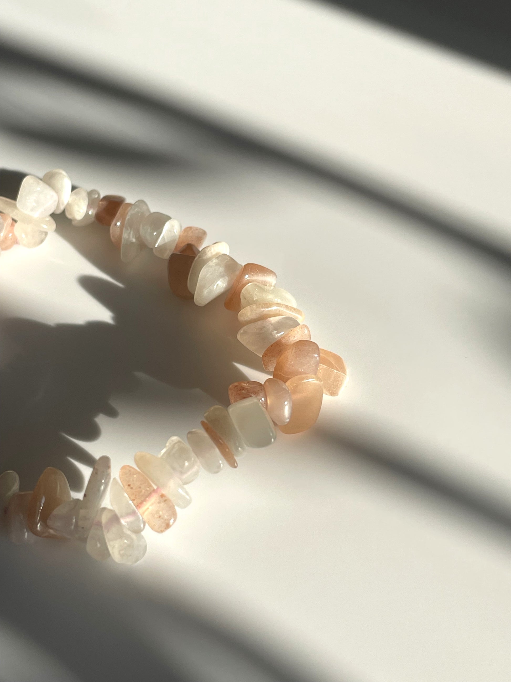 Getrommelte Edelsteinsplitter aufgefädelt auf Stretchgarn